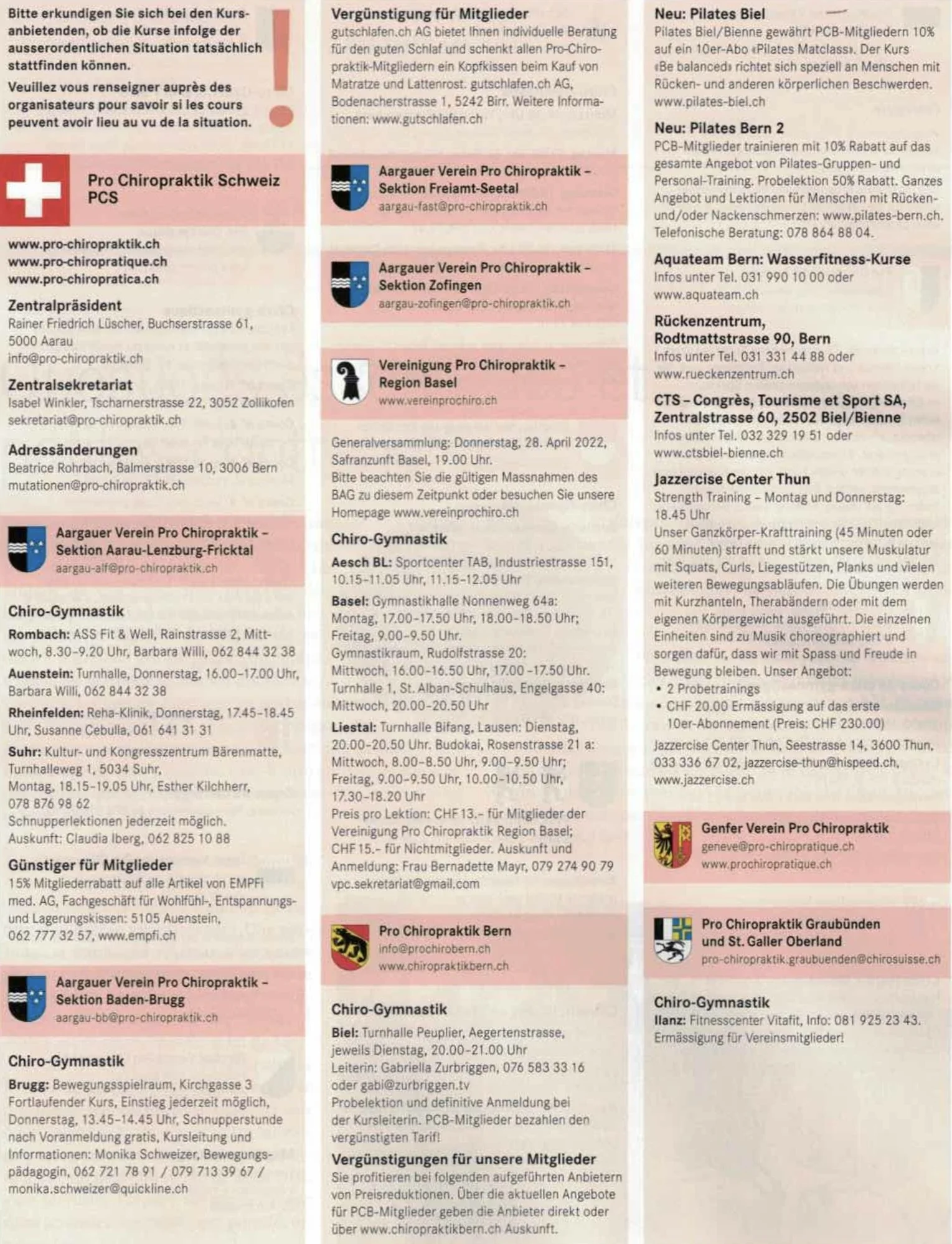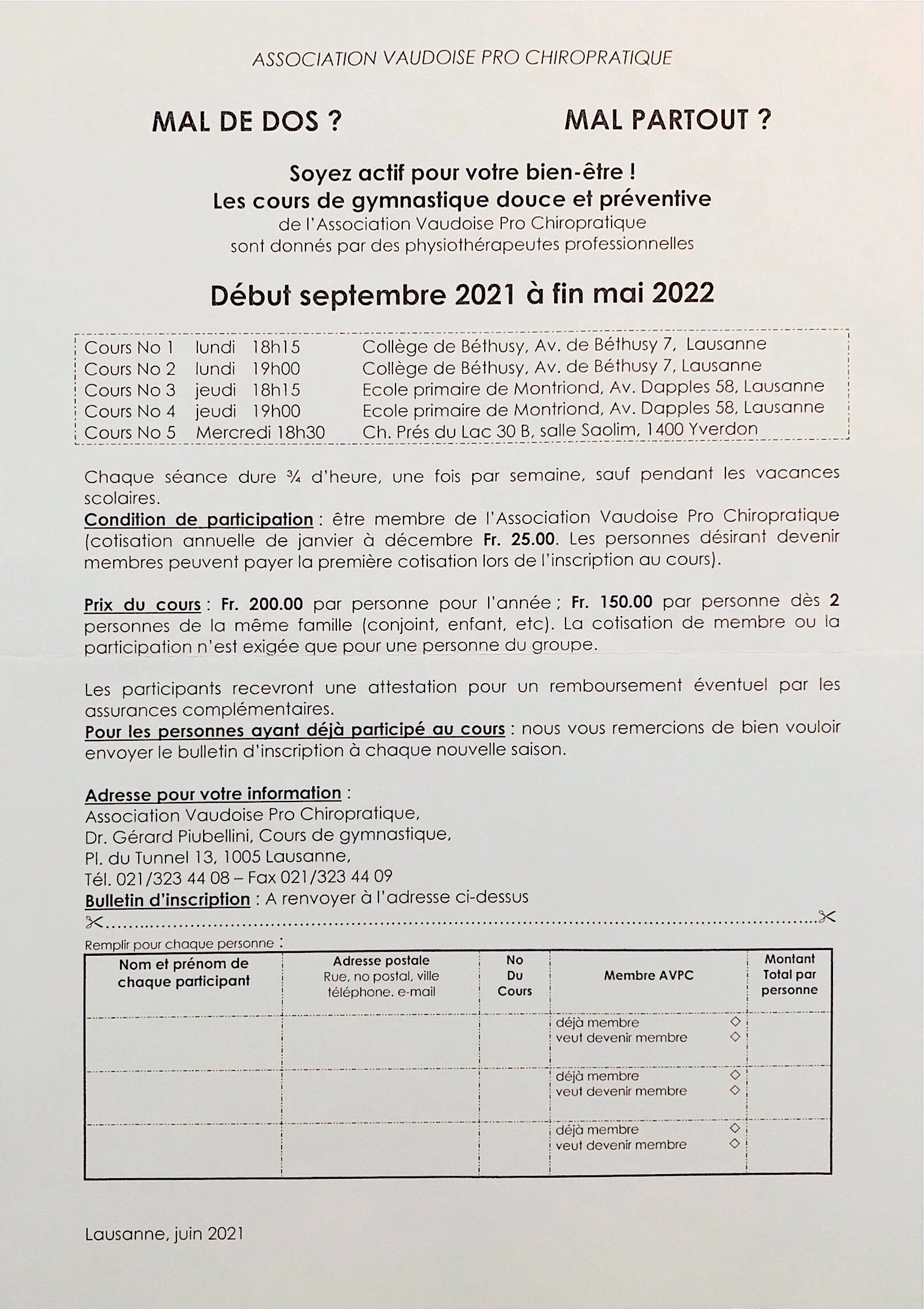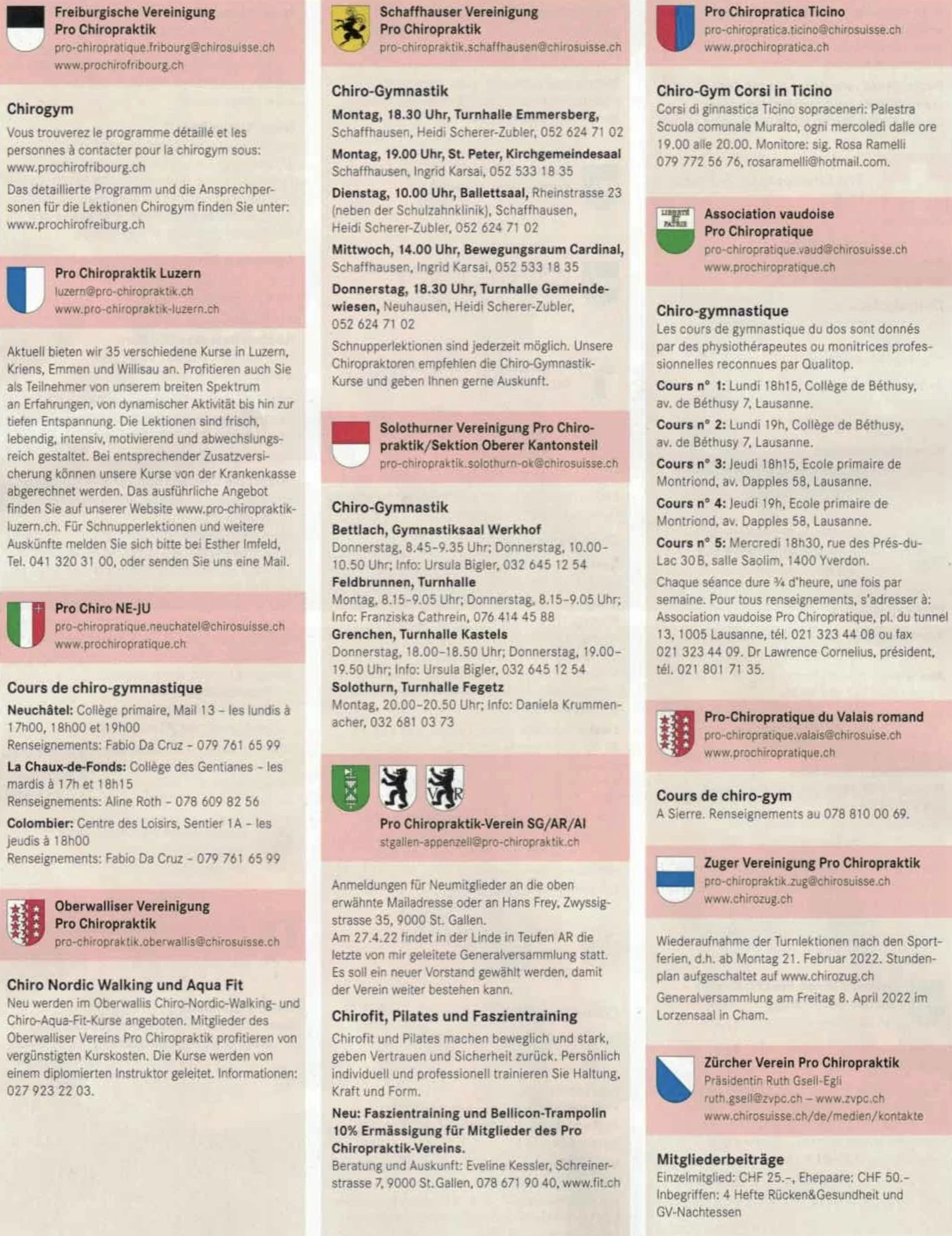 C’est pour ces raisons qu’on demande aux Patients d’adhérer à l’Association Pro-Chiro pour une modique somme, qui donne plein d’avantages. Recevoir le journal de la Pro-Chiro quatre fois dans l’année et participer à la Pro-Chiro Gym, qui est organisée par des monitrices qualifiées.